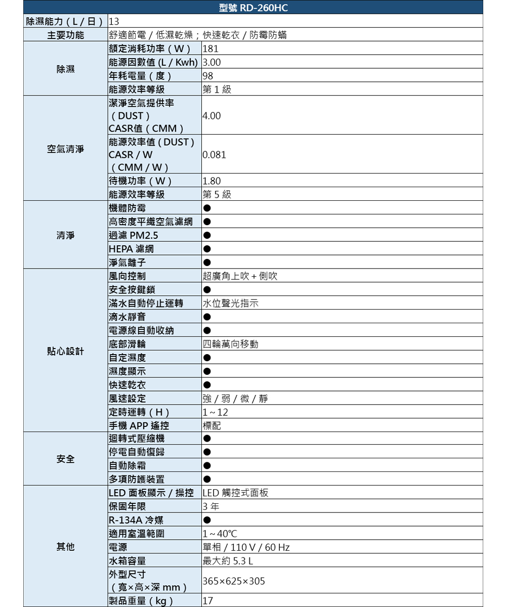 HITACHI 日立1級效能13公升清淨型除濕機 RD-260HC金韻綠
