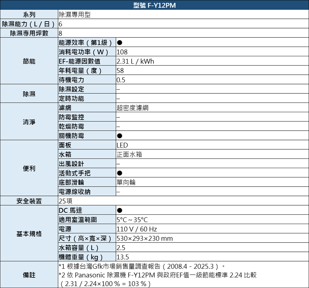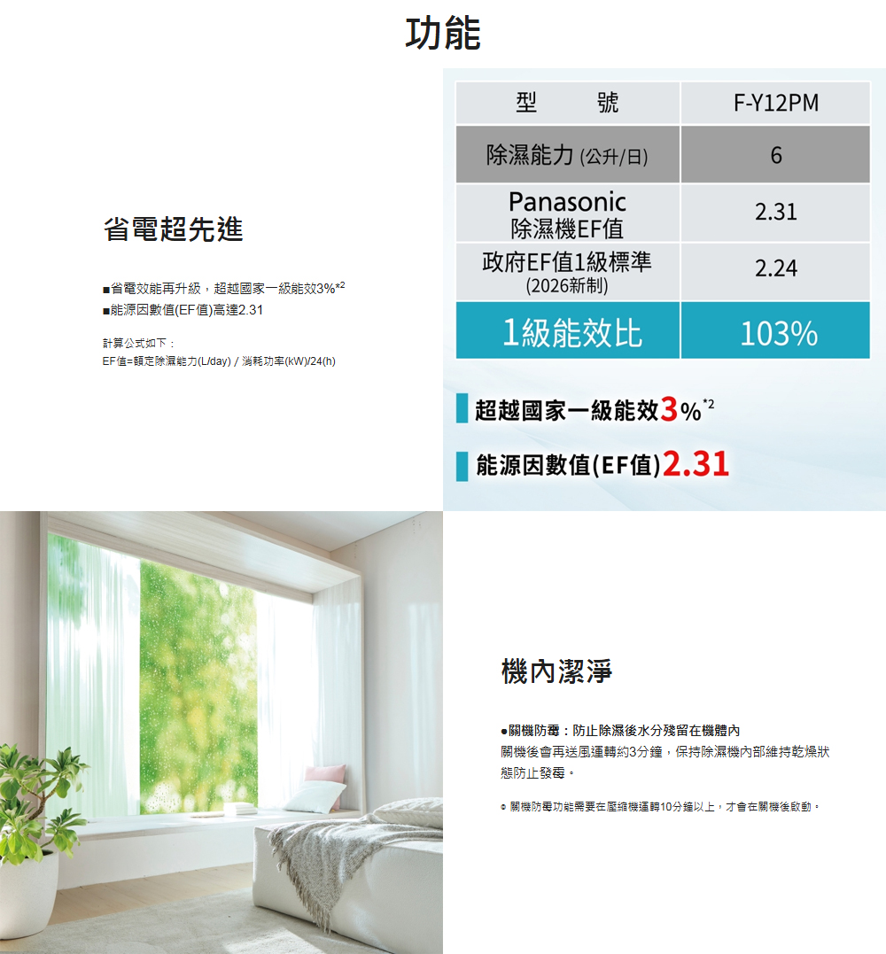Panasonic 國際牌6公升一級能效除濕機 F-Y12PM