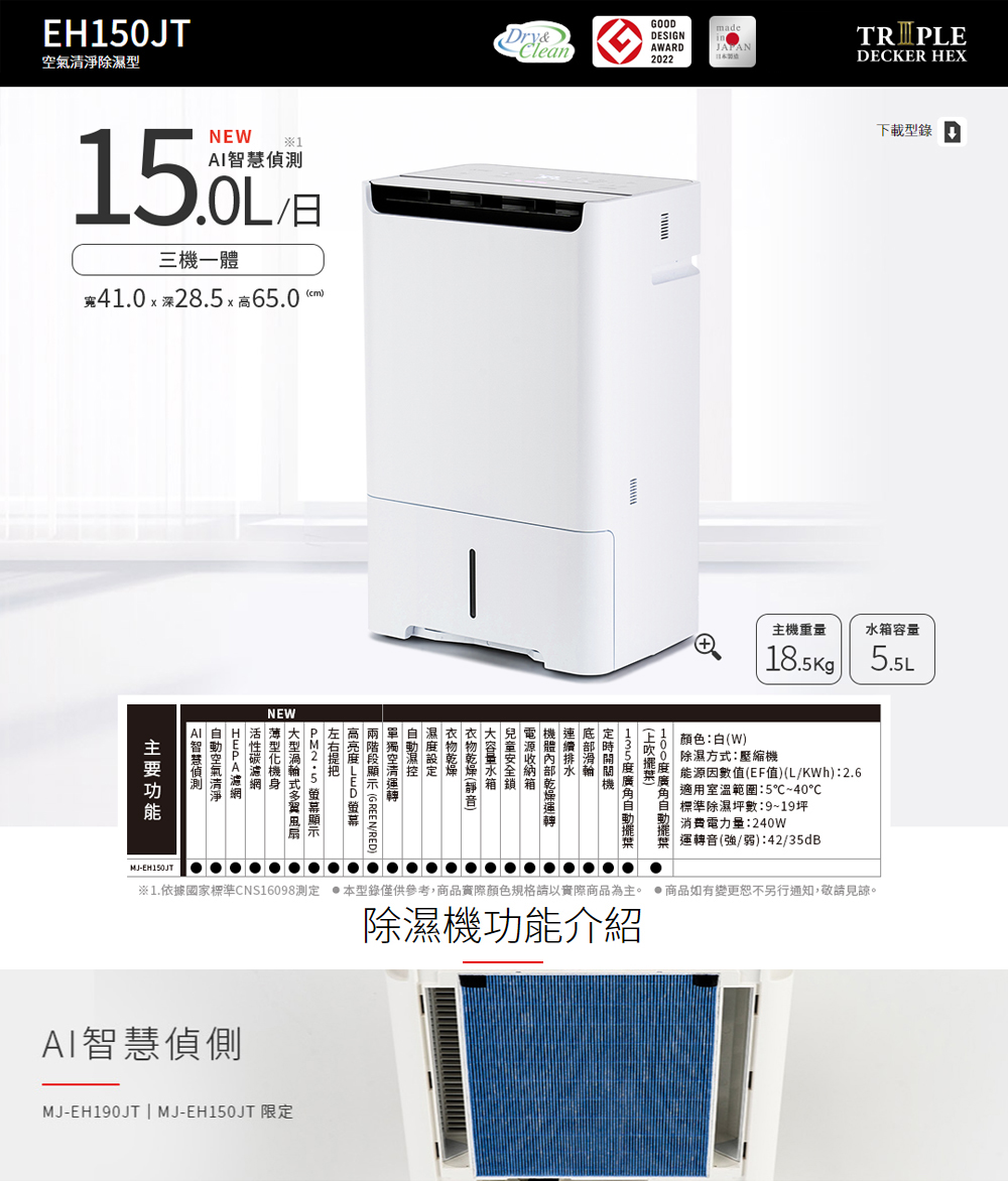 ■ 三重除濕系統■ HEPA濾網、活性碳濾網同時搭載■ 獨立空清運轉